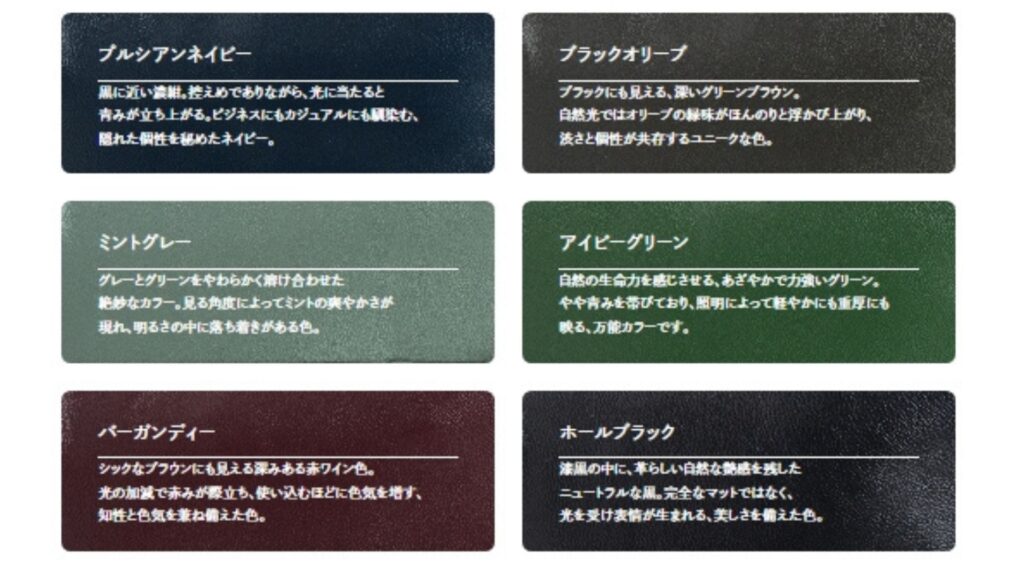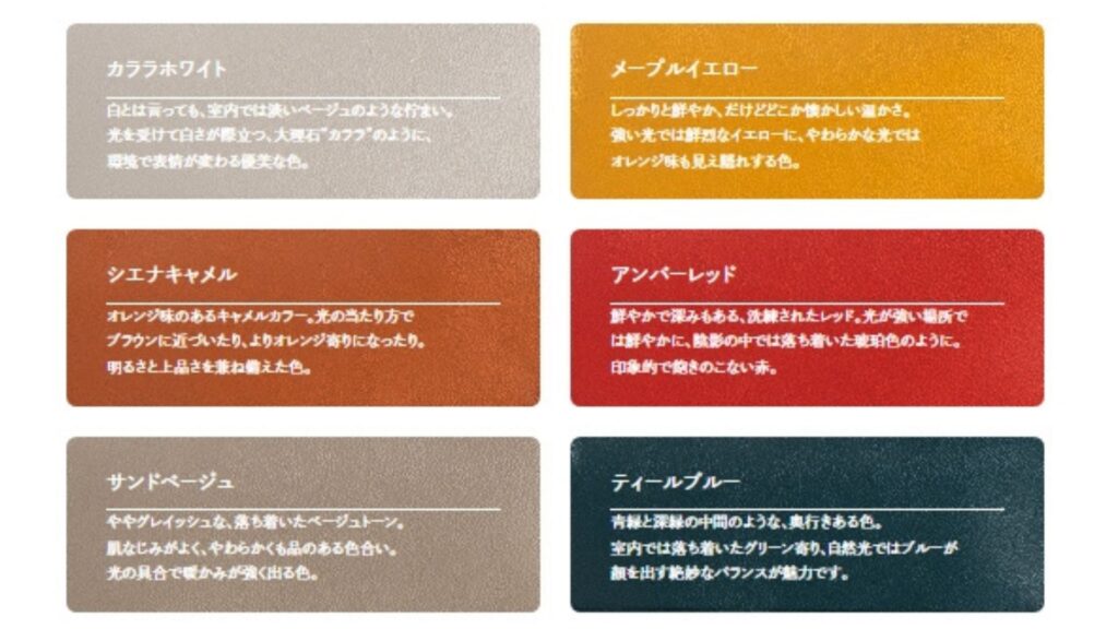 レザーの色は下記の12色が展開されており、男女問わず気に入ったカラーを見つけられるのではないでしょうか?